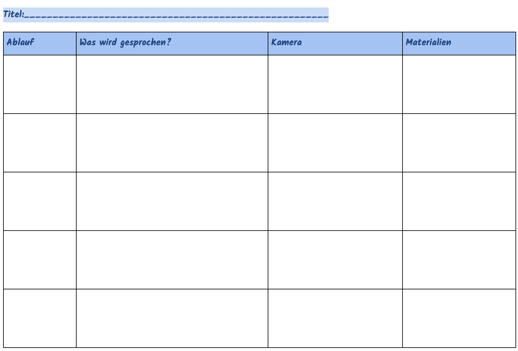 - Notiere dir in der Tabelle, welche Einstellung die Kamera haben soll und was sie aufnehmen soll: Eine Detailaufnahme des Experiments? Dich und das Material für das Experiment?